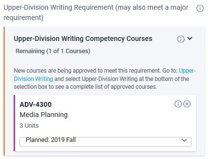 Degree Progress includes typically offered information for most courses. However, course offerings may be subject to change depending upon enrollment demands, curricular changes, instructor availability and/or other factors. If there are no sections of a course available, review your Plannable Requirements to see if there is an alternate requirement you may take coursework in instead. If you need additional assistance in finding an alternate class, check with your academic advisor.