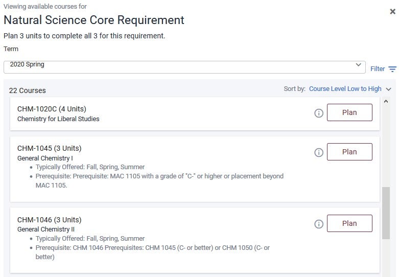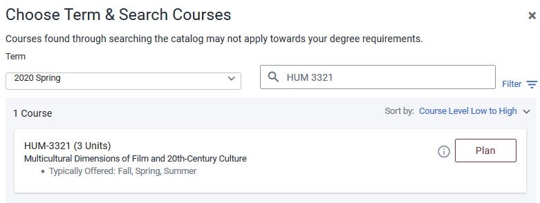 Then use the search box in the top right to find your course. You may search by course prefix and number, course title, or keyword. If using a keyword/title search, the results will include any courses that include the letters you used in the search. Check with your advisor if you have questions about whether a course in the results will satisfy the requirement you need. When you have verified the course you want to plan, click the Plan button.