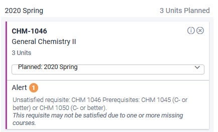 Although Degree Progress will allow you plan a course before you have taken a prerequisite, you may receive an Alert message when planning that you have not yet satisfied a requisite requirement. You may be blocked from enrolling or dropped from a class if you have not satisfied the required prerequisite coursework.