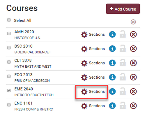 Click the Sections gear beside each course you selected to view the sections available.