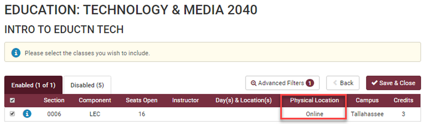 The only sections that will appear in the results are the ones that match the location that you selected in the Physical Location tab. All sections in other locations will be Disabled. Click Save & Close and continue with Generating Schedule options and registration.