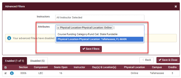 If you need to change the physical location to find other sections, click the Advanced Filters button. You may change the values in the Attributes box to add/remove other locations for the course for that semester. Click Save Filters and continue with registration.