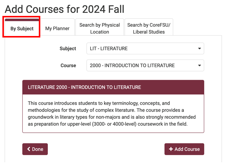 Select one of the tabs to search for a course. You may use the tabs for search for courses by subject/course number, physical location or a CoreFSU/Liberal Studies area. If you already know the subject and course number, the By Subject tab would be the best tab to use.