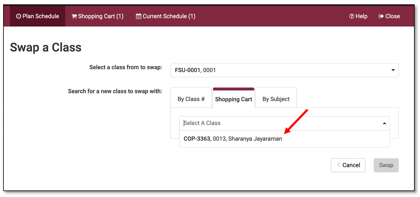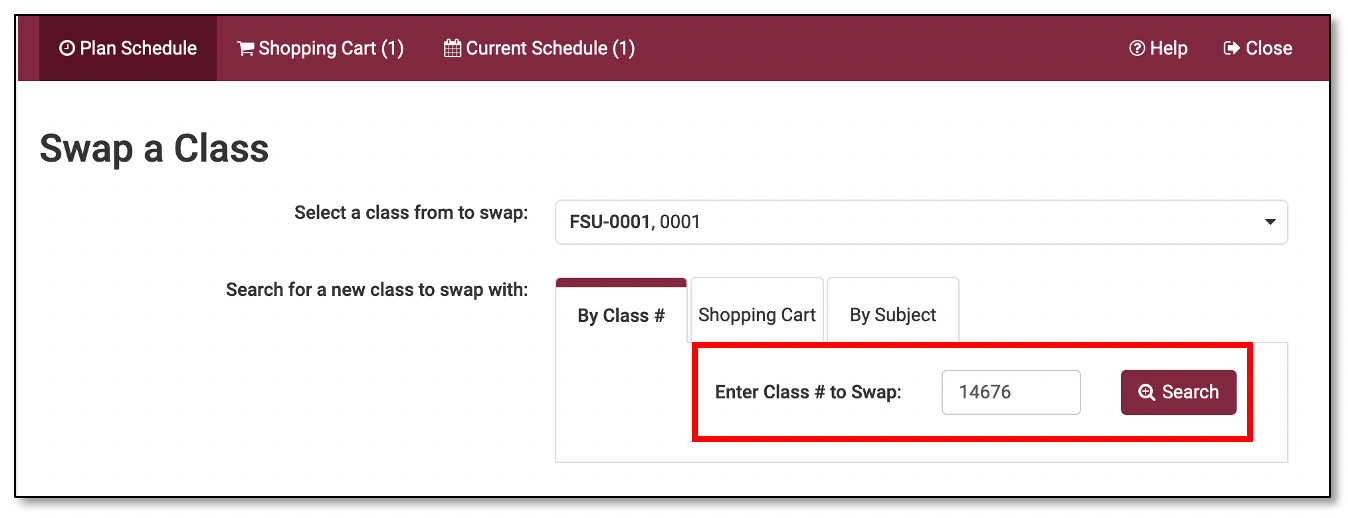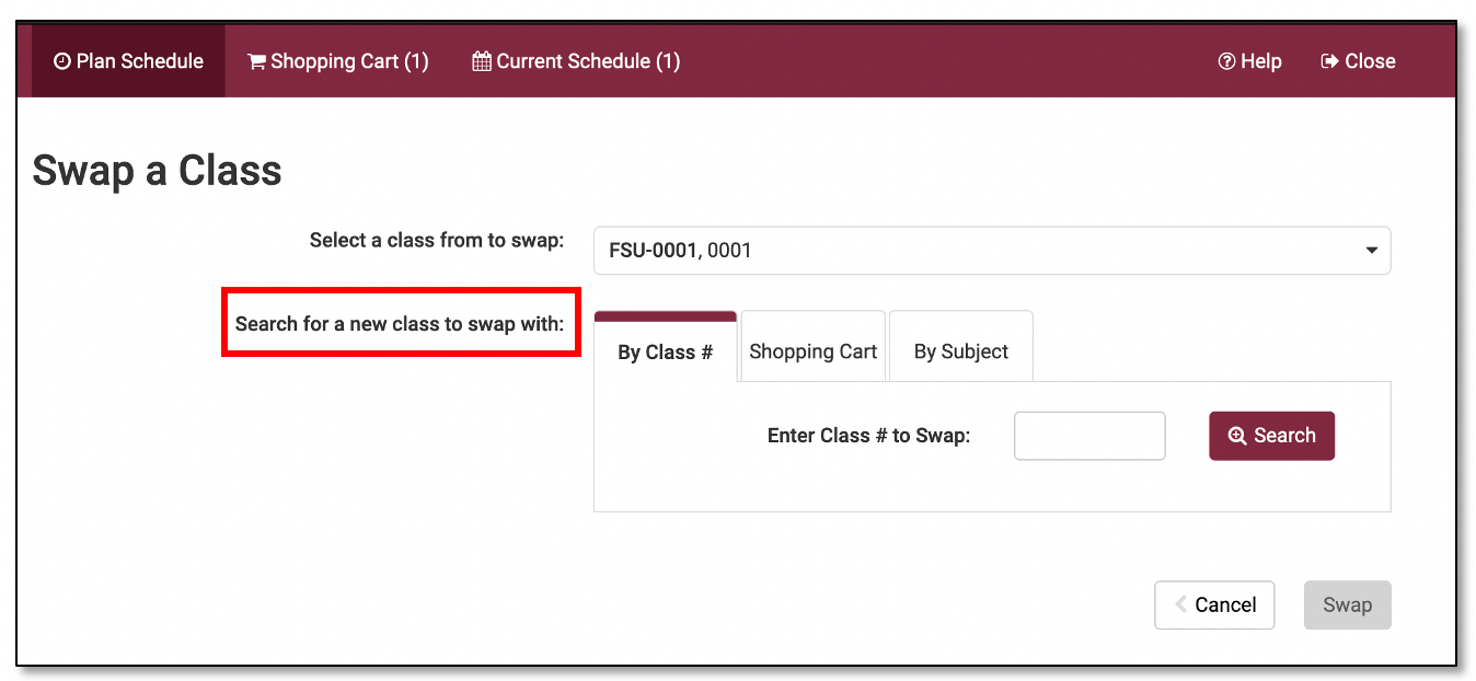 There are three tab options you may use to search for the new class you want to swap into: By Class #; Shopping Cart; or By Subject.